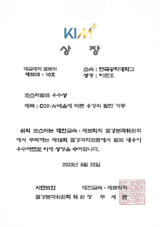 2023년 15회 철강과학포럼 포스터발표 우수상 이준호